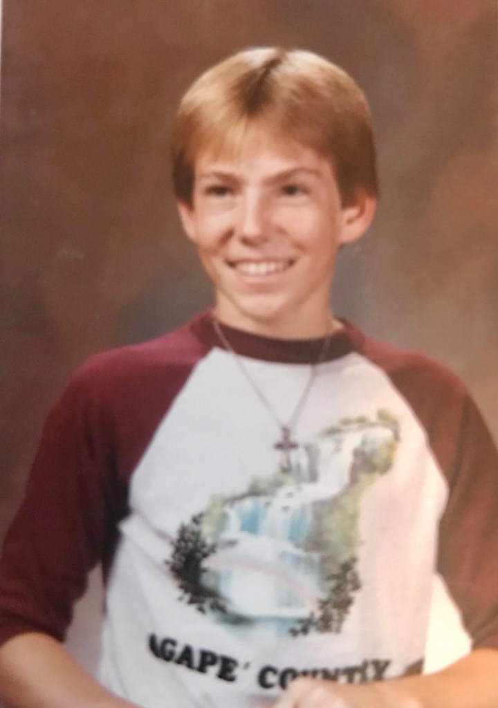 This picture is from my Freshman year in High School. Cross around my neck, bible in my back pocket, and Christian shirt advertising that faith has consumed my thoughts and hopes for the world. Thirty-nine years later, the contents of that new wine remain unchanged today, though the containers I’ve placed it in have been blown apart time and time again.